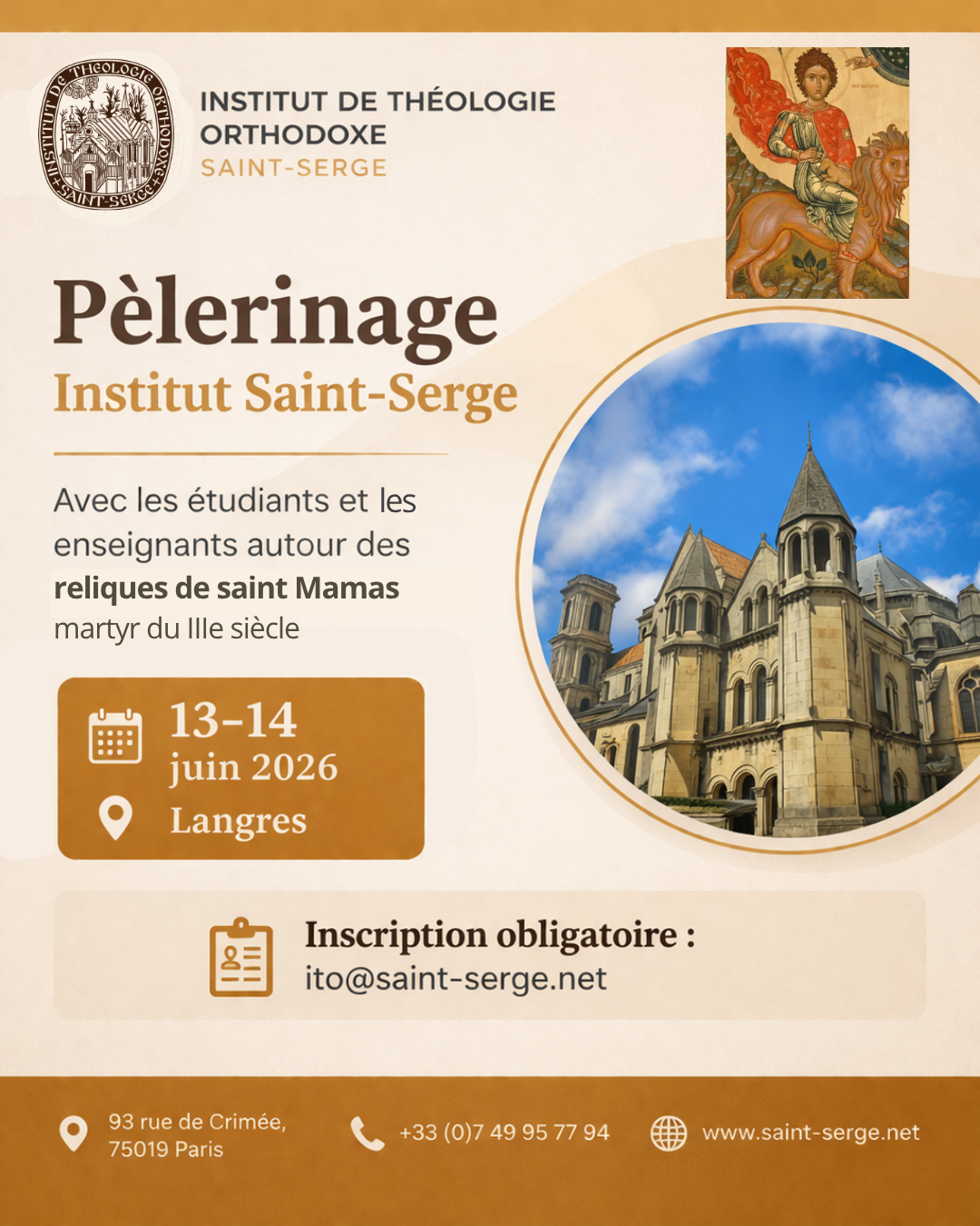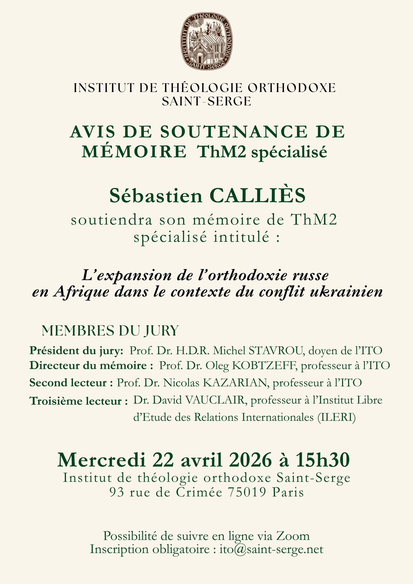 Monsieur Sébastien Calliès, étudiant en deuxième année de ThM spécialisé, soutiendra son travail de recherche de ThM2 spécialisé le mercredi 22 avril 2026 à 15h30 à l’Institut Saint-Serge. Il sera possible de suivre cette soutenance sur place et à distance (via Zoom). Pour obtenir le lien Zoom, merci d’adresser votre demande au Secrétariat de l’Institut à l’adresse suivante : ito@saint-serge.net.